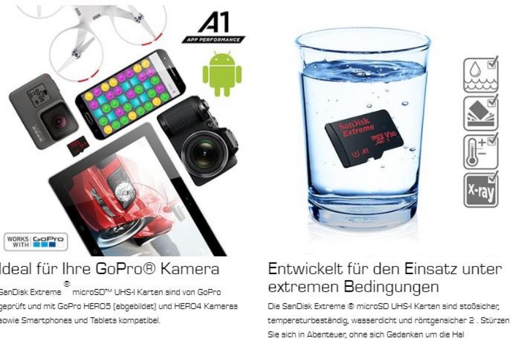 Jetzt können Sie mehr spannungsgeladene Videos in Full HD oder 4K Ultra HD3 mit Ihrem Android-Smartphone, -Tablet oder Ihrer MIL-Kamera aufnehmen. SanDisk Extreme Karten sind für den Einsatz unter extremen, anspruchsvollen Umweltbedingungen gemacht. Durch schnelle Geschwindigkeiten sparen Sie Zeit beim Kopieren von Fotos und Videos auf die Karte oder von der Karte auf den Computer. Speicherkapazitäten von 32GB bis 128GB erweitern den Gerätespeicher und bieten ausreichend Platz für Videoaufnahmen in der neuen 4K Ultra HD-Qualität.