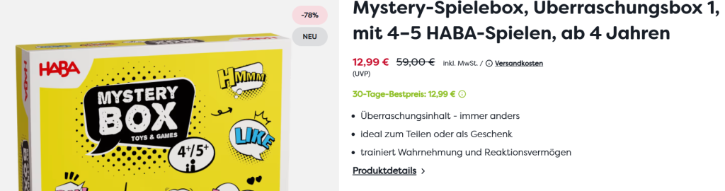 Das HABA-Sortiment umfasst eine Vielzahl an Spielen und Spielsachen, die Kinder fordern, fördern und ihnen vor allem viel Freude bereiten. Aber auch fantasievolle Möbel und Wohnaccessoires, spannende Bücher und schöne Geschenke für jeden Anlass bietet die breite HABA Play-Produktpalette. Einige dieser hochwertigen HABA-Produkte sind im HABA SALE% zu stark reduzierten Sonderpreisen erhältlich.