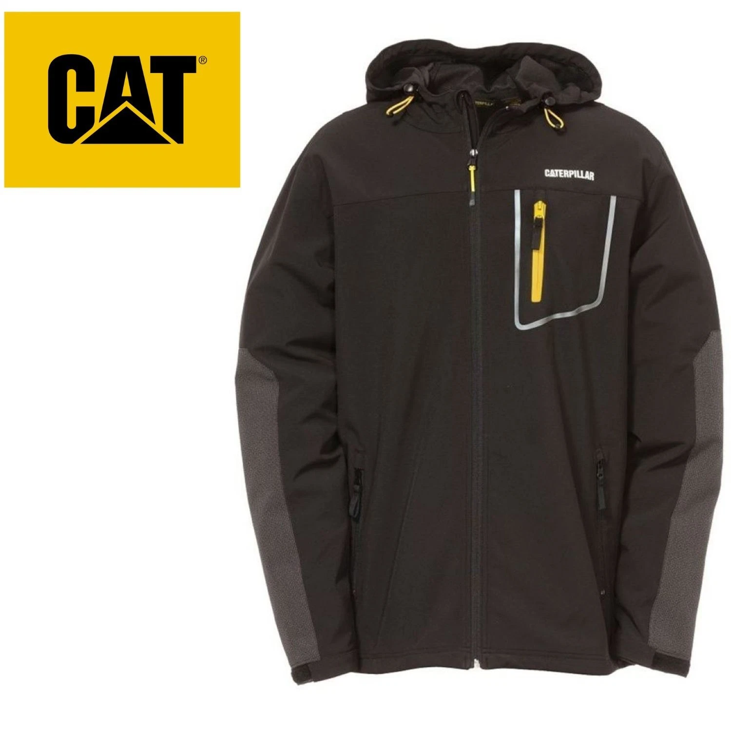 Zudem verfügt die CAT Softshelljacke über zwei Fronttaschen sowie eine Brusttasche mit integriertem Kabelleitsystem.
