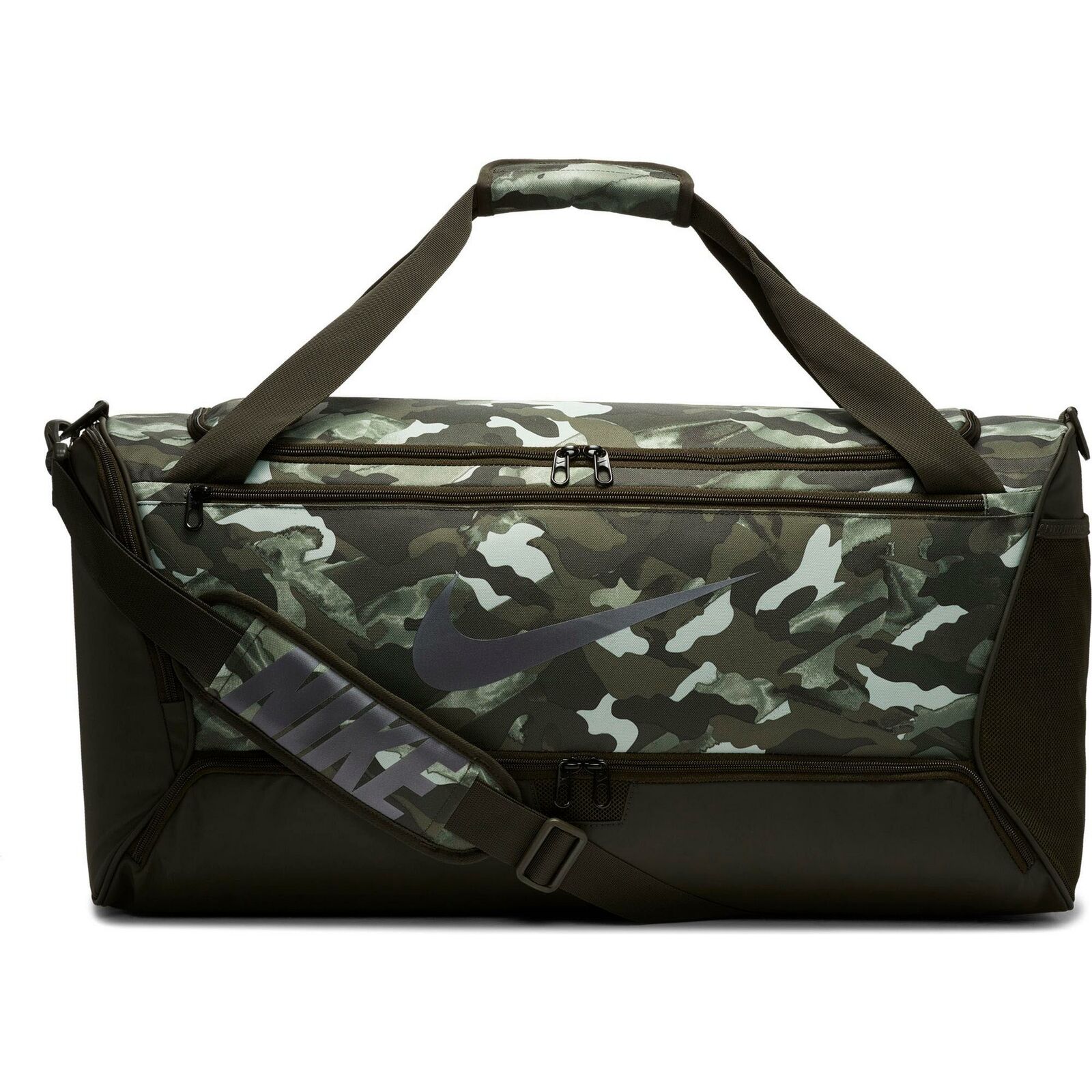 Nike BRASILIA. Sporttasche im Duffle-Style aus strapazierfähigem Material; mit Camouflage-Muster; Hauptfach mit 2-Wege-Reißverschluss; 1 Innenfach mit Reißverschluss; 1 Reißverschlussfach auf der Außenseite; 1 separates Schuhfach; 2 zusammenklettbare Tragehenkel; verstellbarer Schultergurt; beschichteter Boden; Swoosh-Logo; Maße (L/B/H): ca. 63,5 x 30,5 x 30,5 cm (Gr. M); Material 100% Polyester.