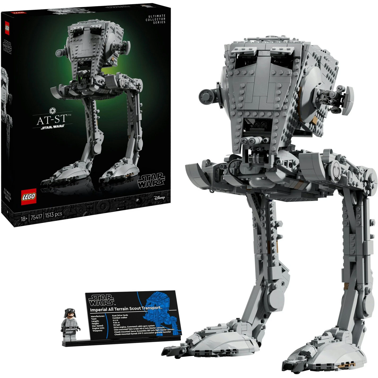 Mit dem AT-ST Kampfläufer aus der Welt von LEGO Star Wars kommt ein Stück galaktischer Geschichte nach Hause. Dieses große Star Wars-Set erinnert an die Schlachten auf Endor und richtet sich an Erwachsene, die sich für Star Wars Modellbau, Technik und detailreiche LEGO-Sets begeistern. Das Set mit 1513 Teilen überzeugt durch seine authentische Darstellung der markanten Beine, durch die beweglichen Sehschlitze und die drehbare Kopfpartie mit verstellbaren Laserkanonen. Die aufklappbare Dachluke gewährt Zugang zum Cockpit mit zwei Sitzen und macht dieses Modell zu einem echten LEGO-Hingucker. Eine LEGO Star Wars Minifigur des AT-ST Piloten mit imperialem Wappen auf dem Arm und eine Infotafel runden das Set ab.