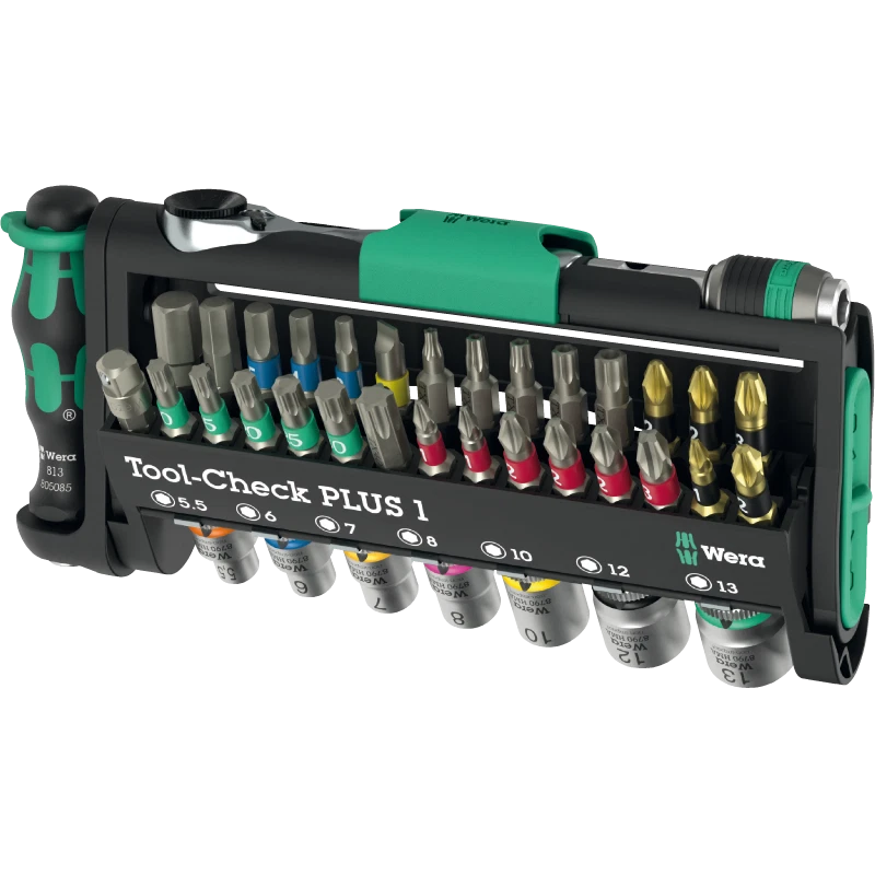 39-teilig. Superkompaktes Werkzeugset für Hand- und Maschinen-Einsatz. Die grünen Verriegelungselemente des Tool-Check sichern die Werkzeuge während des Transports. Inklusive 1/4″ Bit-Ratsche, gelenkgeschmiedete Vollstahlausführung. Feinzahnmechanik (60 Zähne) für einen kleinen Rückholwinkel von 6° für präzises Arbeiten. Einfache Links/Rechtsumschaltung. Ergonomisch geformter Knarrenkopf und -hebel. Mit dem im Set enthaltenen Wera Adapter 870/1 (1/4″ Außensechskant auf 1/4″ Außenvierkant) ist auch der Einsatz von 1/4″-Nüssen möglich. 7 Zyklop Steckschlüsseleinsätze (1/4″) für Hand- und Maschinenbetätigung); mit Kugelfangrille. Rändelung am hinteren Ende für hohe Griffigkeit bei der Handverschraubung. Mit Take it easy Werkzeugfinder: Farbkennzeichnung nach Größen – zum einfachen und schnellen Finden des benötigten Werkzeugs. Aus mattverchromtem Chrom-Vanadium. 28 Bits, BTZ- und BTH-Ausführung mit BiTorsion-Zone (verhindert vorzeitigen Bruch des Bits) und Werkzeugfinder Take it easy: Farbkennzeichnung nach Profilen und Größen), zähharte Ausführung (Z) für den universellen Einsatz, Kreuzschlitz Phillips und Pozidriv, TORX®, TORX® BO, Schlitz und Innensechskant. Im superkompakten, funktionalen Tool-Check.