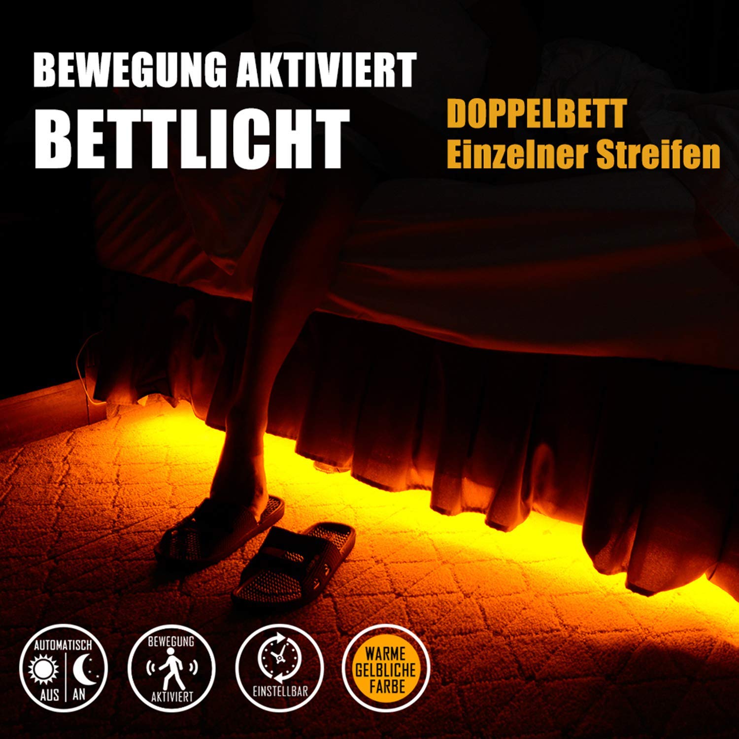 - [NACHTNAVIGATION]: Das Bettlicht leuchtet ultra-warm gelblich, angenehm für die Augen, leitet Sie sicher durch die Nacht, mit Komfort ohne durch Blendung zu stören oder andere aufzuwecken.
