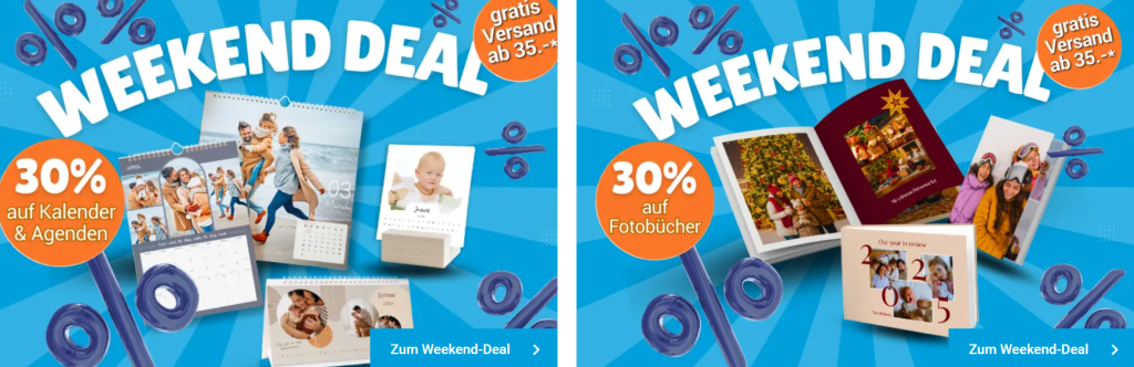 Bei Smartphoto.de bekommt ihr aktuell im Weekend Deal mit 30% Rabatt auf Kalender, Agenden & Fotobücher + gratis Versand ab einem Mindestbestellwert von 35€! Aktionscode: wdbf26sl01