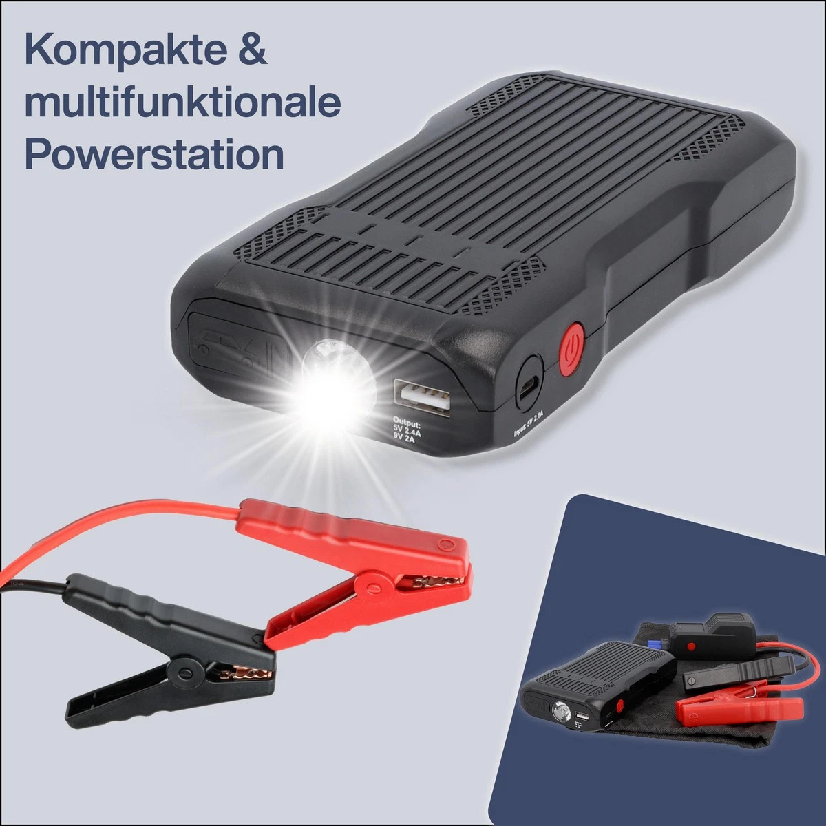 - 3-in-1 Gerät: Starthilfe, Powerbank (8000 mAh) & LED-Taschenlampe in einem