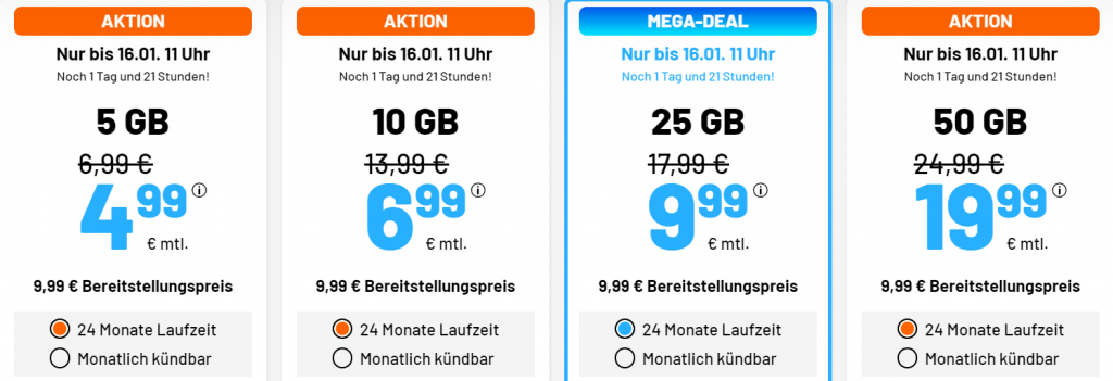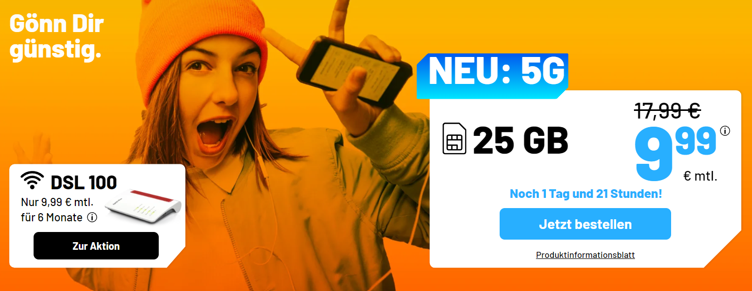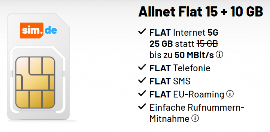 Bei Sim.de bekommt ihr die Allnet Flat + SMS + 25 GB für nur 9,99€ mtl. statt 17,99€, günstiger gab es diesen Tarif bisher noch nie!