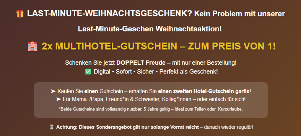 2 x Hotelgutscheine für 2 Pers. – je 3 Nächte – digitales Weihnachtsgeschenk für 39,99€ inkl. Versand!