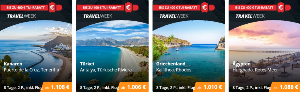 Kombiniere den ab-in-den-Urlaub Cashback-Gutschein (bis zu 750€) mit dem TUI Sofortrabatt (bis zu 400€) und spare damit bis zu 1.150€ auf ausgewählte Reisen.
