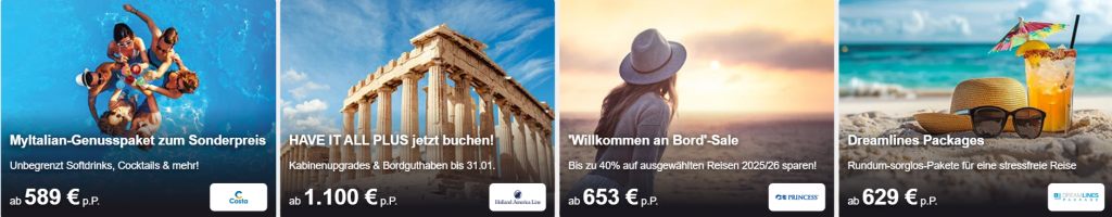 ✓ Attraktive Extras wie Getränkepakete, Kabinen-Upgrades, Transfers, Ausflüge und Stadtrundfahrten