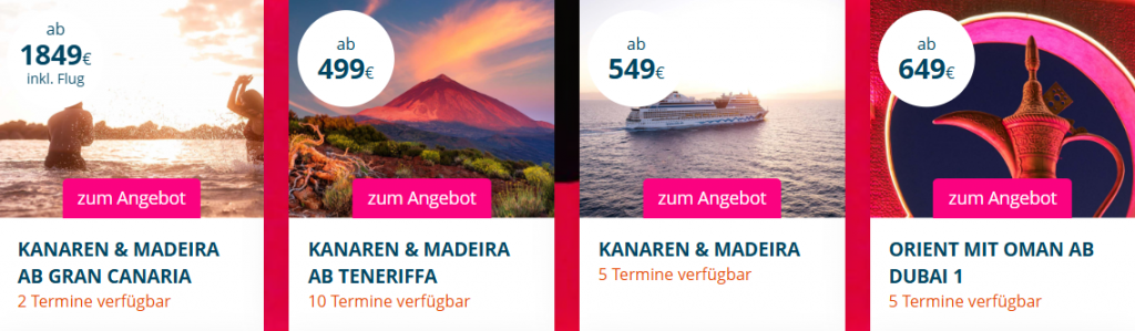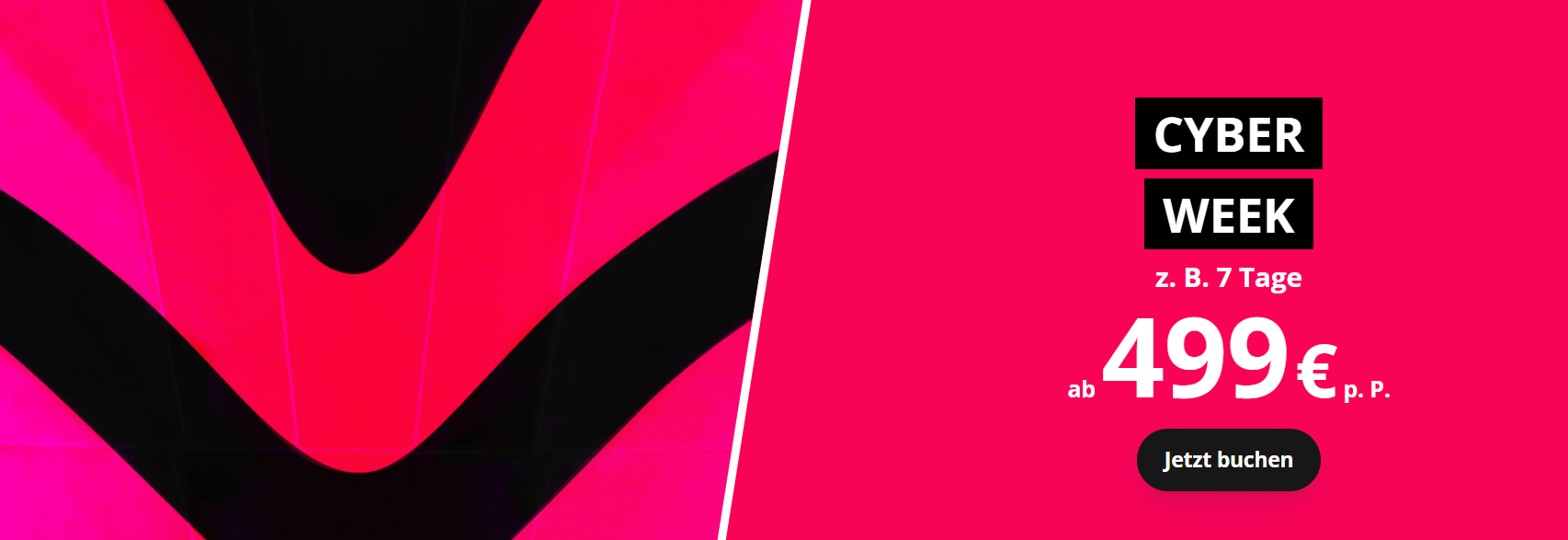 Schon ab 499€ p. P. genießt ihr z. B. auf den Kanarischen Inseln einen Vorgeschmack auf den Frühling. Auch auf unseren Orient-Reisen stehen alle Zeichen auf Sonne satt. In ein wahres Winter Wonderland entführt euch dagegen AIDAnova. Welche dieser Traumreisen soll euer Cyber Week Herzblatt sein?