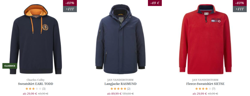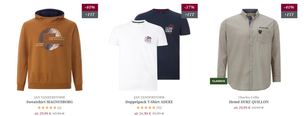 Jan Vanderstorm, eine bekannte Marke, die sich auf Herrenmode in großen Größen spezialisiert hat, hält derzeit einen Knallerpreise mit Rabatten von bis zu -70% ab. Dieser saisonale Ausverkauf umfasst typischerweise eine breite Palette von Artikeln aus ihrer Sommerkollektion und bietet eine großartige Gelegenheit, hochwertige Kleidung zu reduzierten Preisen zu erwerben.