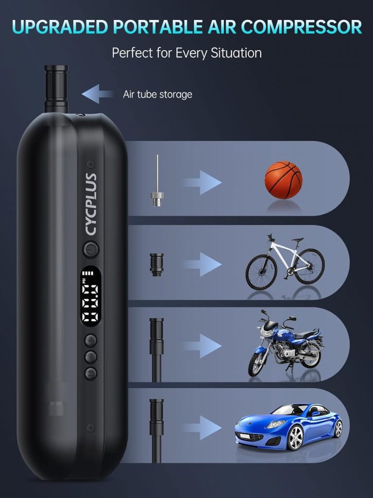 Die CYCPLUS Luftpumpe ist ein kompakter und vielseitiger elektrischer Kompressor, der sich ideal zum Aufpumpen von Reifen bei Fahrrädern, Motorrädern und Autos eignet.