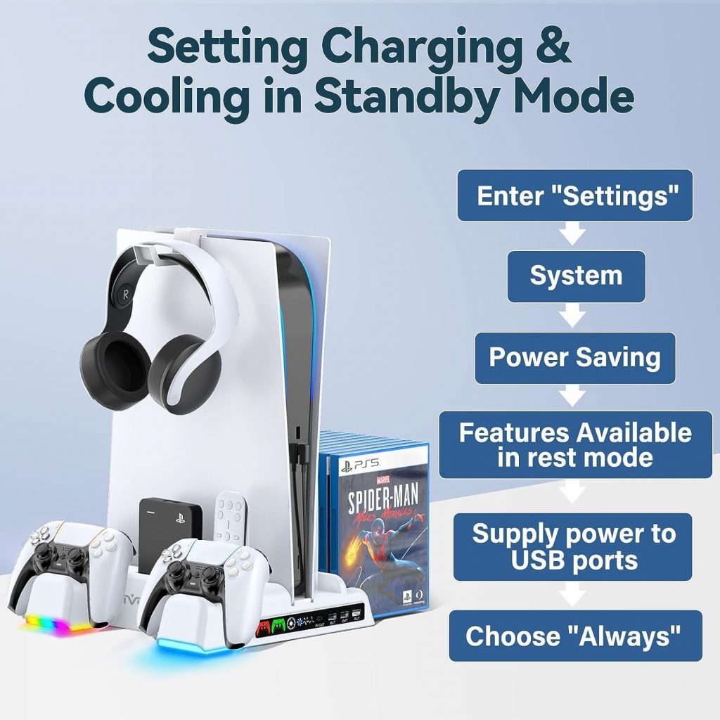 • Schnellaufladung und RGB-Anzeige: Dieser PS5 Kühlständer – Ladegerät kann zwei Playstation 5 Controller innerhalb von 2,5 Stunden gleichzeitig aufladen. Weiter gibt es noch ein RGB Licht für den Status der Aufladung – Rot lädt auf, Grün ist voll geladen/Standby.