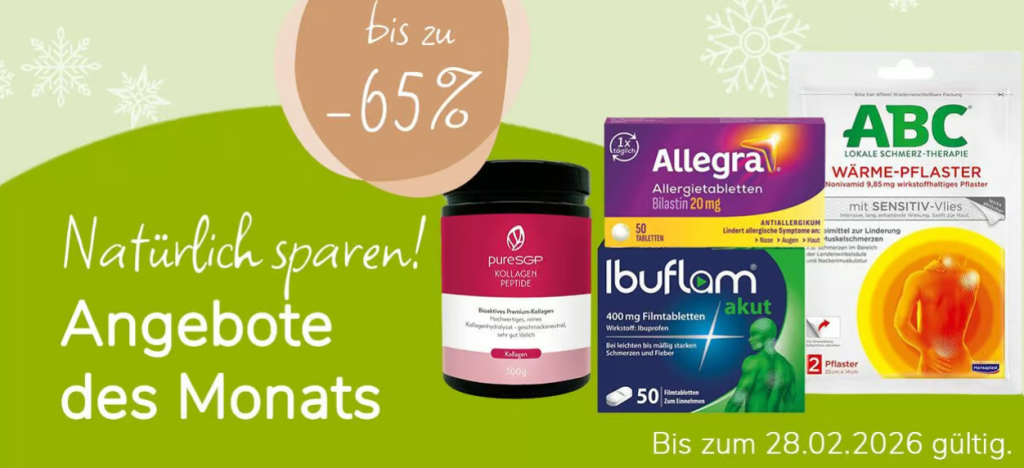 Deine Lieblingsprodukte aus der Apotheke Aliva – im Winter-Sale zum Vorteilspreis! Ob pflanzlich, klassisch oder homöopathisch: Stöbere durch unsere Auswahl an Bestsellern für Immunsystem, Haut und Seele.