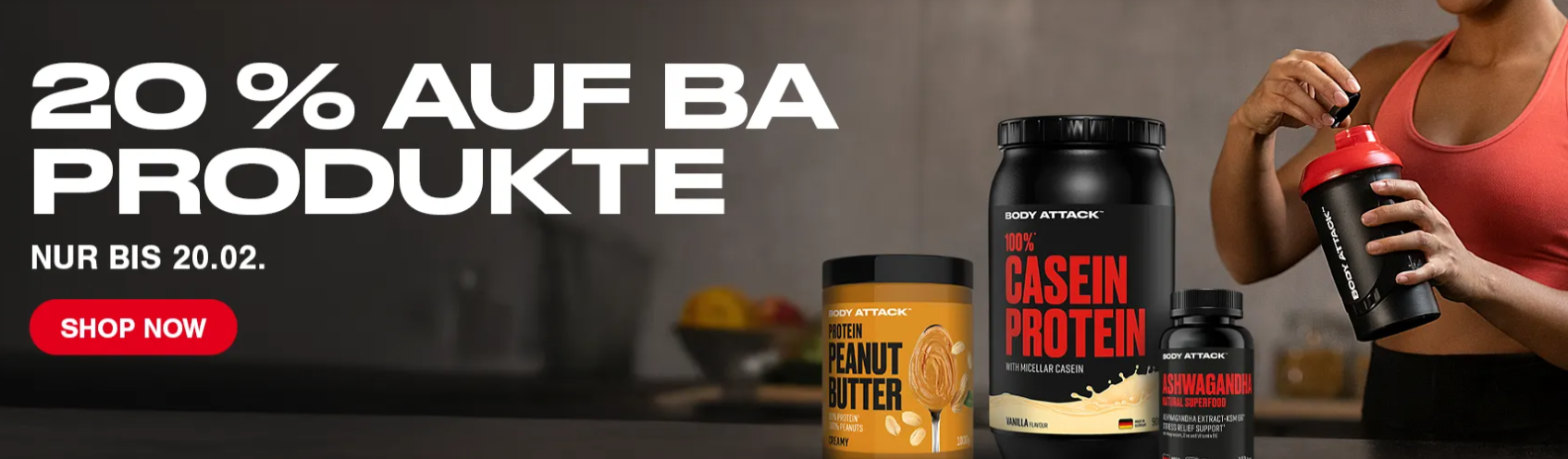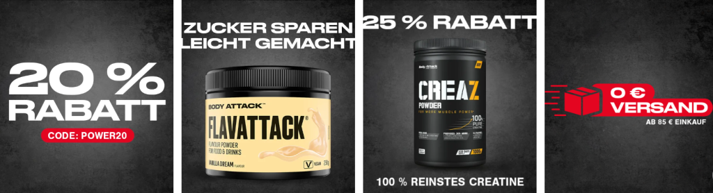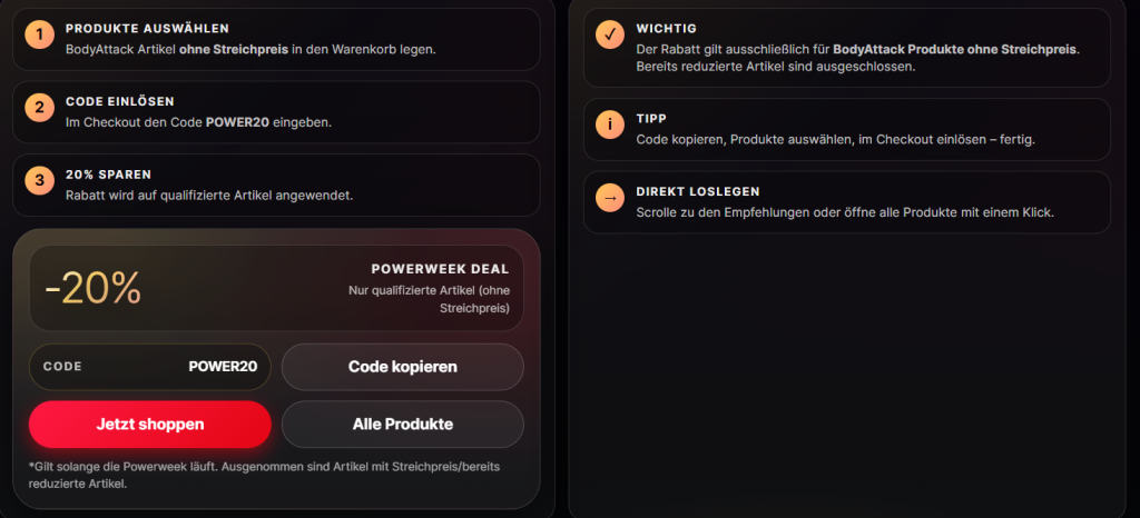 POWERWEEK bei Body Attack mit 20% Rabatt auf BA Produkte! Sichere dir -20% auf alle BodyAttack Produkte ohne Streichpreis. Einfach im Checkout den Code: POWER20 eingeben und sparen.