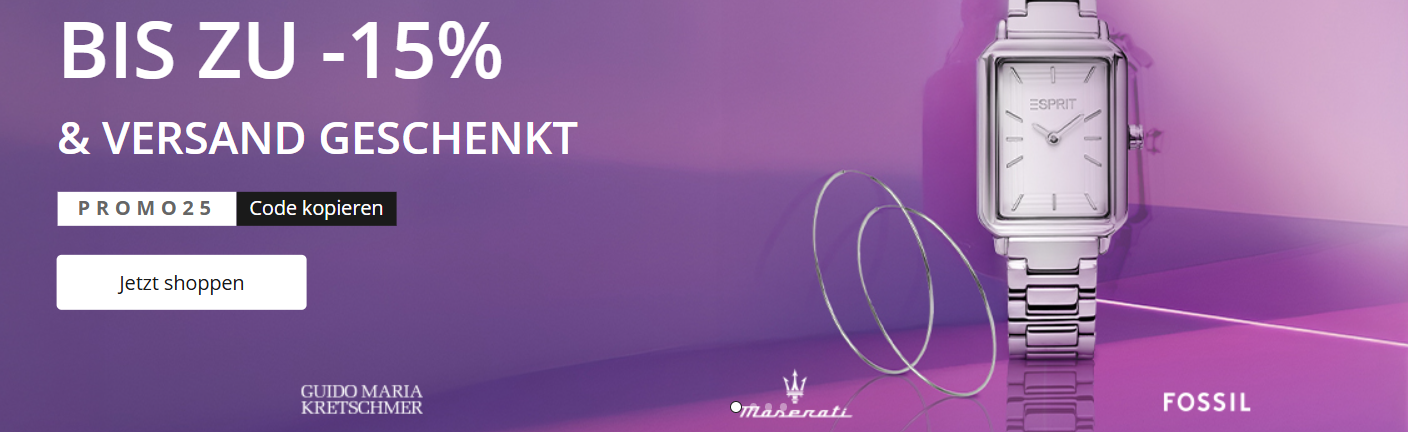 Sichere dir jetzt bis zu 15% Rabatt und kostenfreien Versand auf ausgewählten Schmuck und Uhren! Gib einfach den Code: PROMO25 ein. Das Angebot gilt bis zum 19.08.2025 – schnell zugreifen und sparen!