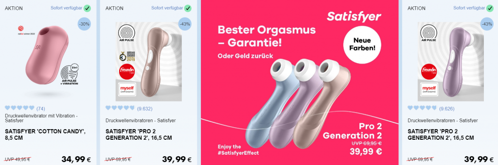 So findest Du genau das richtige Sexspielzeug für Deine Bedürfnisse und kannst je nach Stimmung auswählen, wonach Dir ist. Viele Druckwellenvibratoren in unserem Sortiment sind übrigens wasserdicht (IPX7) und können Dich so auch in der Badewanne verwöhnen – was Du übrigens unbedingt einmal ausprobieren solltest! Die meisten Modelle sind außerdem mit einem wiederaufladbaren Akku ausgestattet.