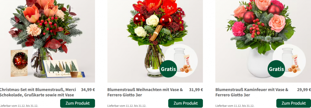 FloraPrima bietet häufig Frühbucher-Rabatte für saisonale Anlässe wie Weihnachten an. Ein 10% Frühbucher-Rabatt bedeutet, dass Kunden, die frühzeitig Weihnachtsbestellungen wie Blumen, Geschenksets oder Dekorationen aufgeben, 10% Ersparnis auf eure Bestellung erhalten könnt.