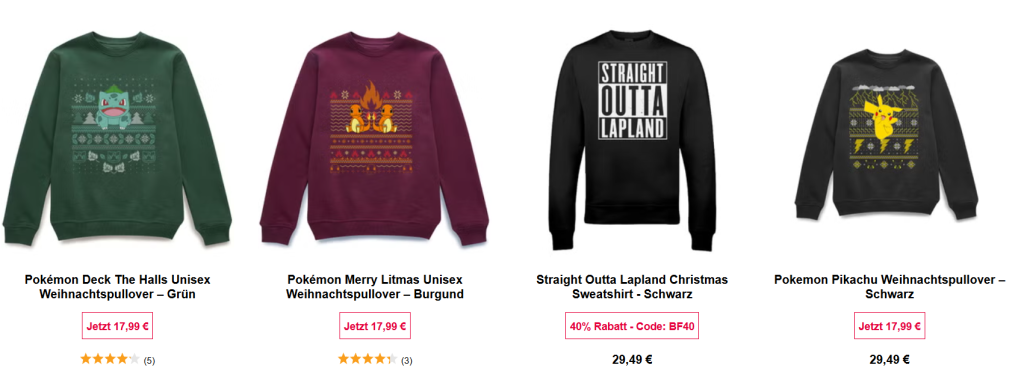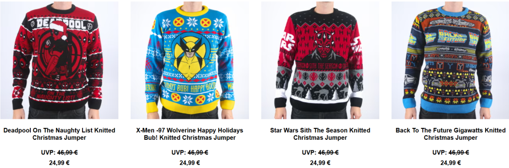 Starte fröhlich in die Weihnachtszeit mit einer Riesen Auswahl an lizenzierten Weihnachtspullovern (Herren, Damen, und Kinder). In unserem Weihnachtsschlitten findest eine top Auswahl an  Weihnachts-inspirierter Kleidung mit Designs deiner Lieblingsfilme und Serien: Star Wars, Marvel (inkl. Spider-Man und Deadpool), DC Comics (inkl. Batman), Disney, Elf, Harry Potter, Rick & Morty, der Grinch und mehr!