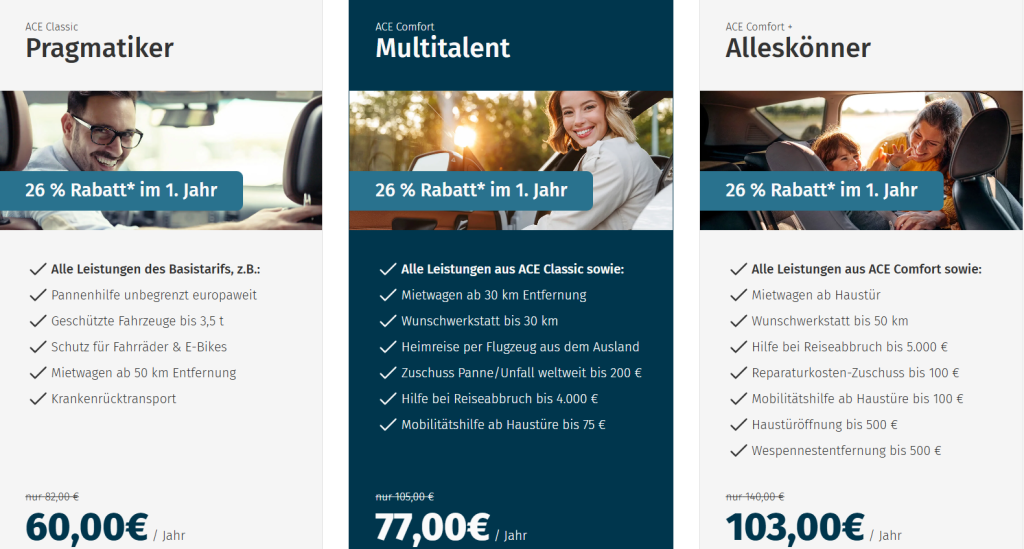 Mit dem ACE genießt ihr umfassende Leistungen, faire Tarife und verlässlichen Service – rund um die Uhr, in ganz Europa. Ob auf dem Weg zur Arbeit, in den Urlaub oder bei spontanen Fahrten: Wir sind immer an eurer Seite. Jetzt Mitglied werden und 26 % sparen! Sichert euch eure Vorteile und startet bestens vorbereitet ins Jahr 2026.