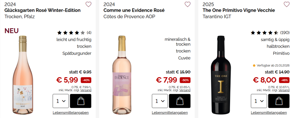 Das Jahr 2026 fängt richtig gut an! Freut euch auf die ersten Tiefstpreise für ausgewählte Weine und prickelnde Genießer-Tipps. Jetzt zu außergewöhnlichen Konditionen mit bis zu 50% Ersparnis!