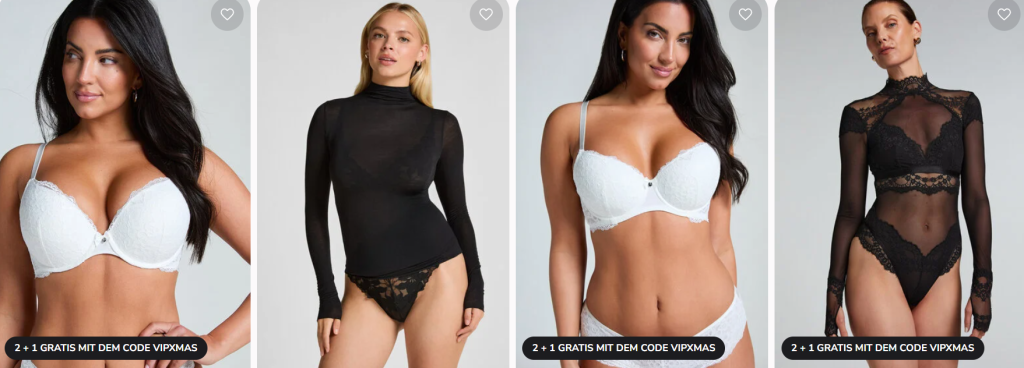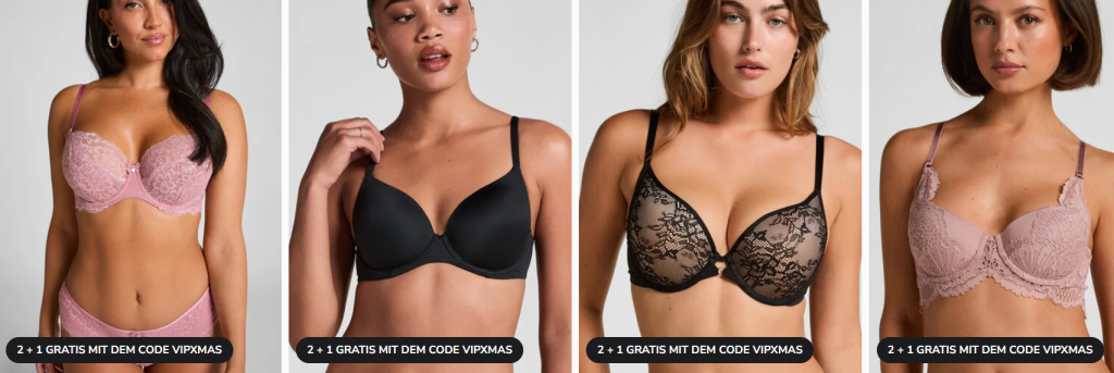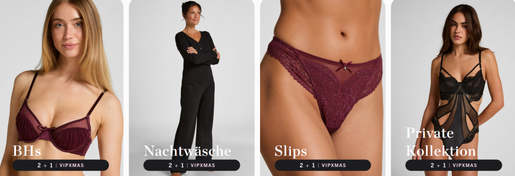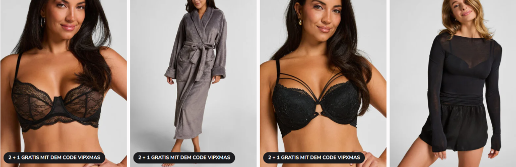 Bei Hunkemöller bekommst du aktuell 2+1 auf ausgewählte Artikel mit dem Code: VIPXMAS