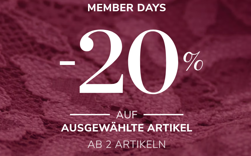 Das klingt nach einem tollen Angebot! Während der Hunkemöller – MEMBER DAYS erhältst du 20% Rabatt auf ausgewählte Artikel – ab 2 Artikeln!