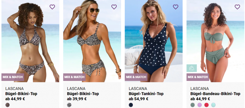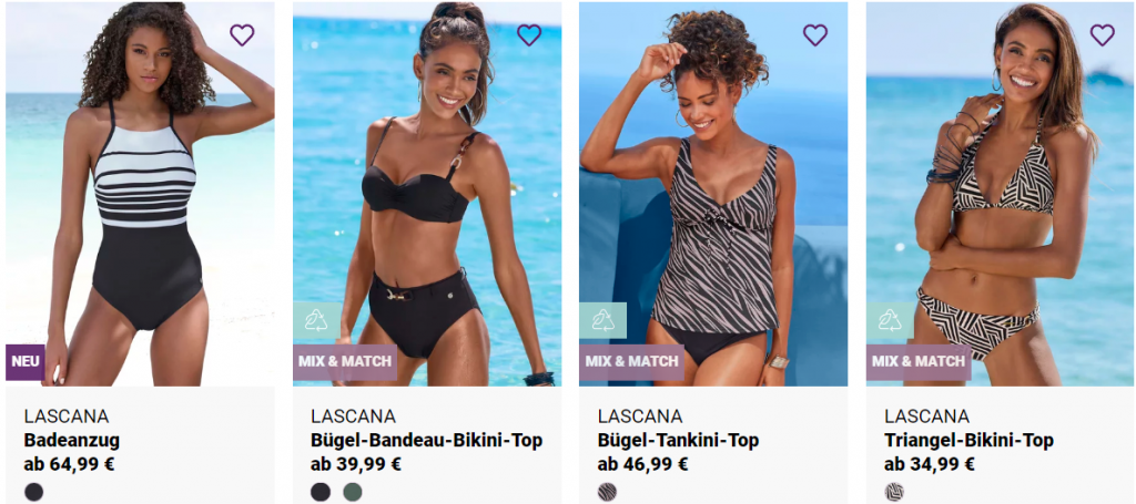 Die Bademode von LASCANA zeichnet sich durch elegante Schnitte und modische Rafinesse aus. Egal ob du ein sexy Badeanzug oder lieber einen sportlichen Bikini wünschst – bei uns im Online Shop wirst du fündig. Grundsätzlich hast du die Auswahl zwischen folgenden Bekleidungsstücken: