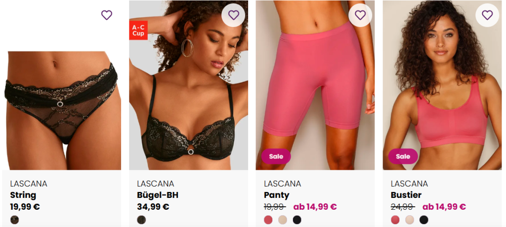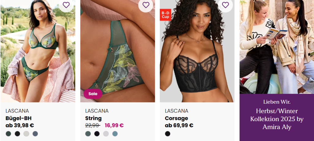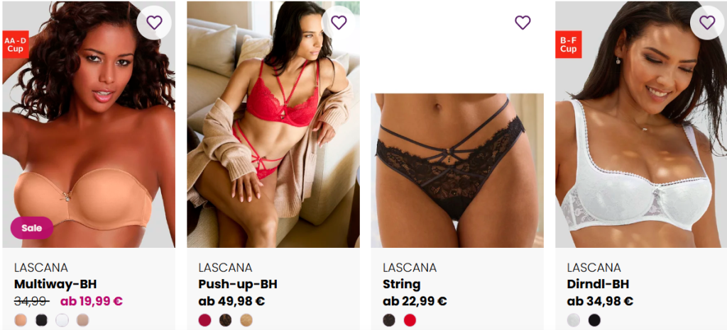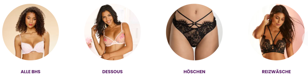 - Dessous & Lingerie: Verführerische BHs, Slips, Bodys und mehr in vielen Größen (auch für große Cups).