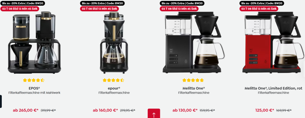 Melitta® Online Shop – BLACK WEEK DEALS – bis zu 40% Rabatt! Entdecke unsere sensationellen Black Week Angebote – Bis zum 01.12.2025 erwarten dich im Melitta® Online Shop tolle Angebote rund um Kaffeevollautomaten, Filterkaffeemaschinen, passendes Zubehör und Maschinenpflege!