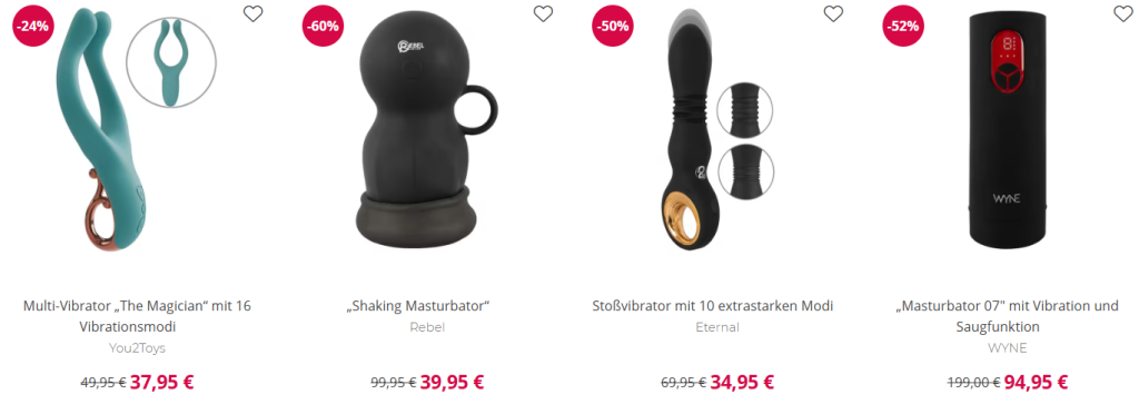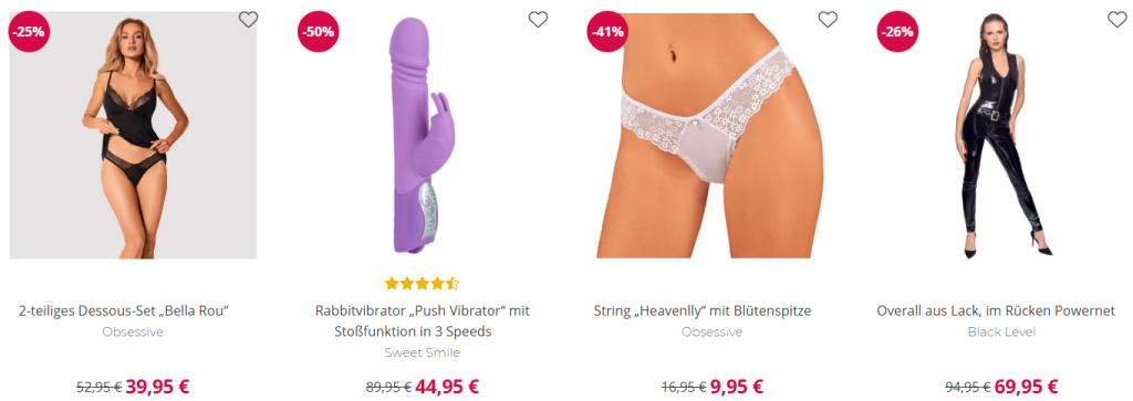 Ob verführerische Wäsche, leistungsstarke Lustbegleiter oder pflegende Essentials – hier findest du alles, was deine intimen Momente bereichert. Nutze die Chance auf hochwertige Produkte zu attraktiven Angeboten und sichere dir erotische Favoriten, solange sie verfügbar sind. Jetzt stöbern, sparen und deine Leidenschaft neu beleben.