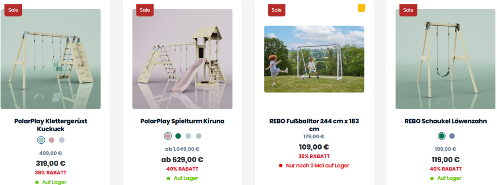 Du kannst dich beim Kauf unserer Outdoor Spielgeräte nicht nur auf eine hochwertige Qualität, sondern auch auf einen fairen Preis verlassen. Bei uns erwarten dich regelmäßige Aktionen, bei denen wir ausgewählte Modelle und Sets mit deutlichem Preisvorteil anbieten.