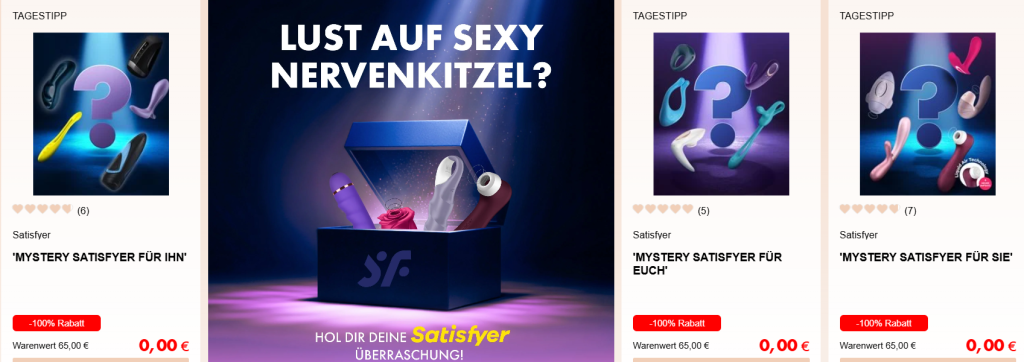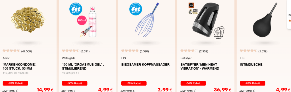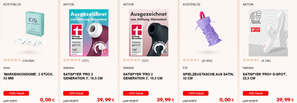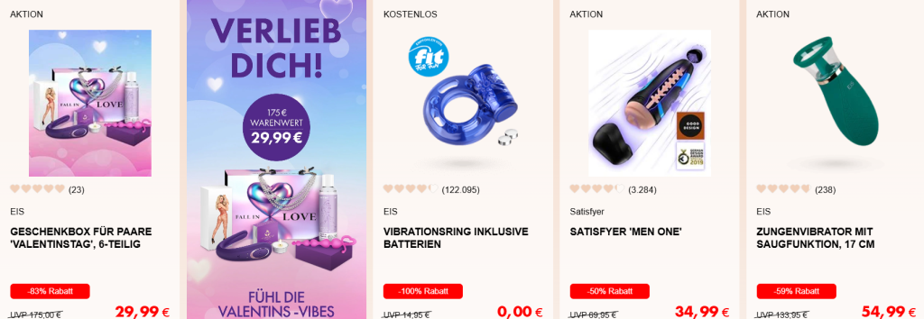 Unschlagbar günstig, tolle Qualität! Entdeckt eure Sinnlichkeit bei EIS.de mit hochwertigen Sextoys, Bondage-Produkten, sinnlichen Dessous, Pflegeartikeln und vielem mehr. Ob betörende Vibratoren oder verführerische Höschen – hier wird für jeden Geschmack die heißesten Neuigkeiten sowie nationale und internationale Top-Marken zu erschwinglichen Preisen angeboten. Und das nicht nur in der Sale-Kategorie. Für Kunden wird ständig das Sortiment mit innovativen Produkten von höchster Qualität angepriesen. So schafft EIS.de die perfekte Plattform zum Stöbern, für Inspiration und Spaß.