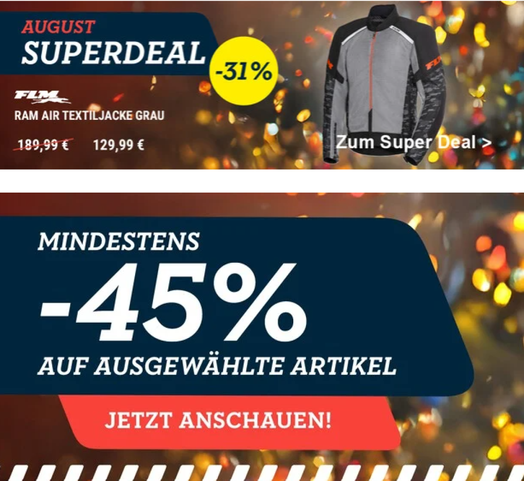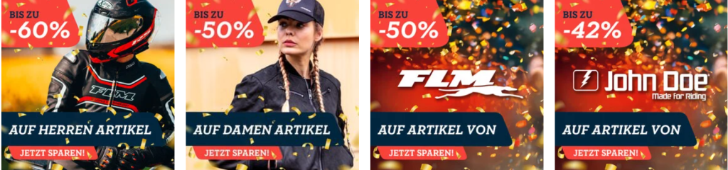 Ob Kurztrip oder Langstrecke, jeder Motorradfahrer braucht entsprechende Motorradbekleidung. Im POLO Motorrad Online Shop findet ihr Motorradbekleidung & Motorradzubehör namhafter Marken. Im POLO BIRTHDAY BASH könnt ihr aktuell Bekleidung & Restposten bis -70% sparen!