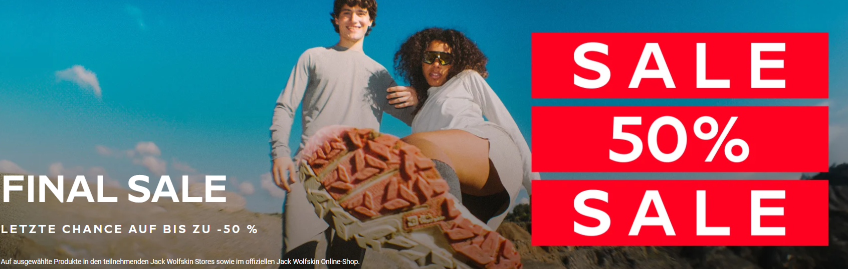 FINAL SALE bei Jack Wolfskin, hier gibt es akuell bis zu 50% Rabatt! Nur auf ausgewählte Artikel im Jack Wolfskin Online-Shop und nur solange der Vorrat reicht. Der Rabatt wird im Warenkorb abgezogen.