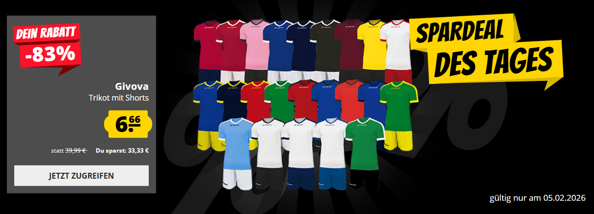 Bei SportSpar gibt es aktuell im Spardeal des Tages das Givova Kit Revolution Fußball Trikot mit Shorts in verschiedenen Farben für 6,66€ statt 39,99€ zzgl. Versand! Ersparnis: 33,33€