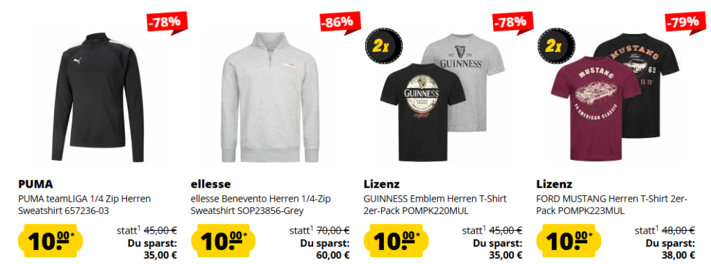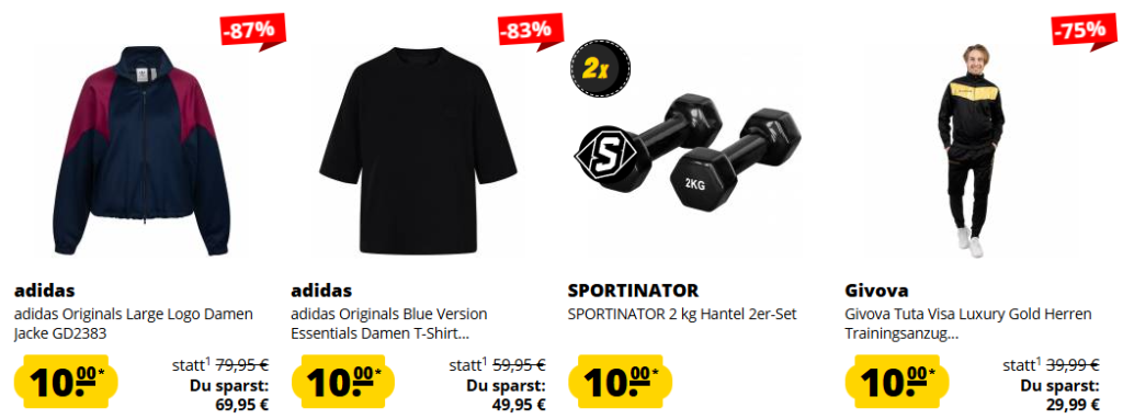 Entdecke stark reduzierte Markenartikel im SportSpar Sale – alles für nur je 10€. Ob Sportbekleidung, Trikots, Taschen oder Sportequipment für Damen, Herren und Kinder – hier kannst du richtig sparen. Jetzt deine 10-€-Deals sichern – solange der Vorrat reicht!