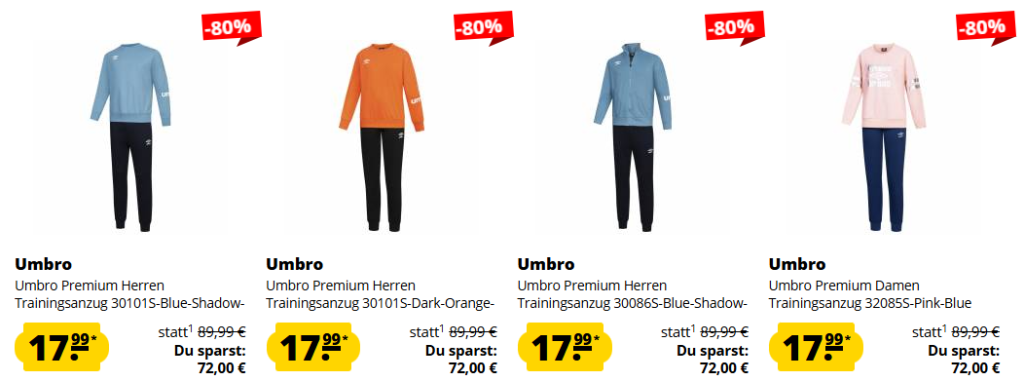 Umbro Trikots und Teamwear zum Sparpreis – Umbro PREMIUM ANZÜGE mit 80% Rabatt! Ihr zahlt 17,99€ statt 89,99€ inkl. Versand!