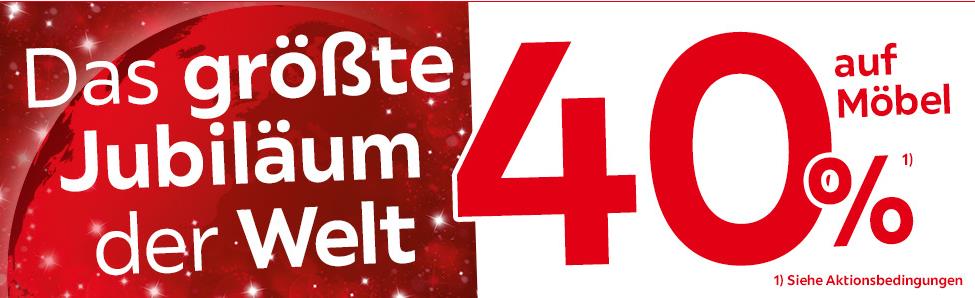 Als besondere Rabatt-Aktion während des größten Jubiläums der Welt bekommt Ihr 40% auf Euren nächsten Möbeleinkauf geschenkt. Auch in den weiteren Aktions-Kategorien findet Ihr stark reduzierte Produkte.