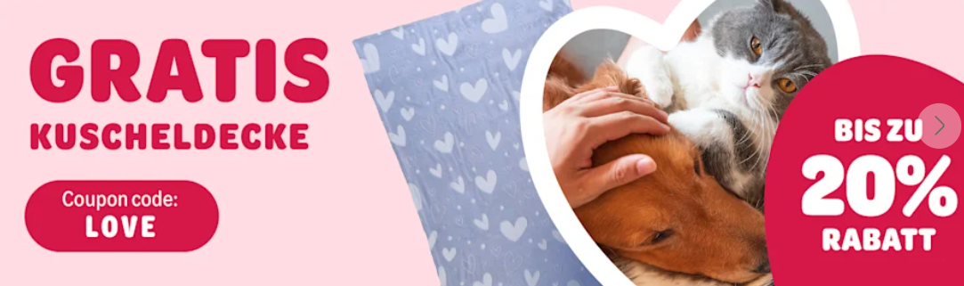 Valentinstag bei zooplus, hier bekommst du noch für kurze Zeit bis 20% Rabatt auf ausgewählte Produkte + Gratis Kuscheldecke! Aktions-Code: LOVE