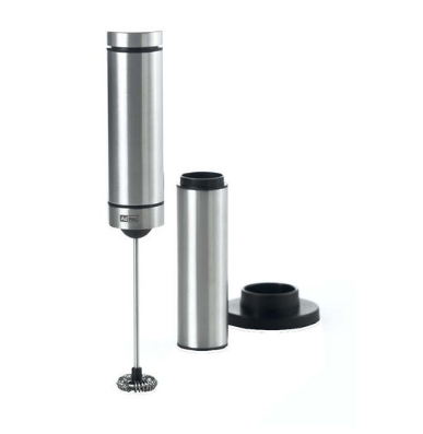 Der batteriebetriebene Milch- und Saucenaufschäumer RAPIDO bereitet mit kraftvollem Antrieb und verstärktem Edelstahl-Stiel innerhalb kürzester Zeit luftigen Schaum für Latte Macchiato, Cappuccino und viele weitere Kaffee-Spezialitäten. Zur Reinigung werden Stiel und Quirl unter laufendes Wasser gehalten, den Quirl kann man aber auch abziehen und in die Spülmaschine geben. Aufbewahrt wird RAPIDO im mitgelieferten Ständer. (Batterien im Lieferumfang enthalten)