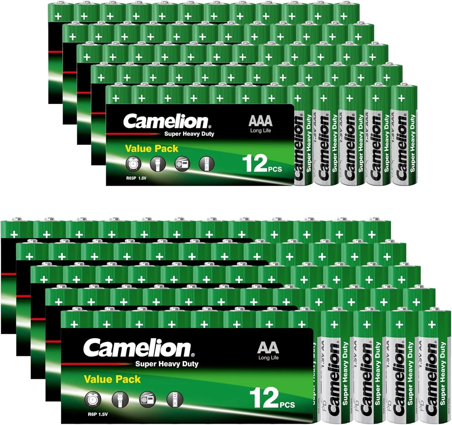 Praktisches Batterien-Set von Camelion mit insgesamt 120 Stück – bestehend aus 60 AA und 60 AAA Batterien. Ideal für den täglichen Haushaltseinsatz, Büro oder Vorrat.