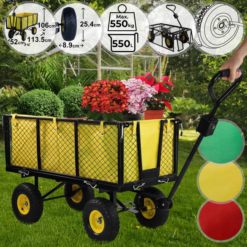 Technische Informationen: Abmessungen (Länge x Breite x Höhe): 113,5 x 52 x 106 cm Belastbarkeit: 550kg Reifen: 254 x 88.9 mm (10″ x 3.50″) Ladefläche: 96 x 50 x 36 cm Struktur: pulverisierter Stahl Räder: Gummi (Kunststofffelge) Stoff: Polyester mit PVC beschichtet (einlagig) (420D) Farbe: Gelb-Schwarz