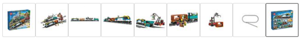 - Inhalt der Box: Lok, Flachwagen, offener Wagen, Autotransportwagen, 2 Elektroautos, Ladestation, 2 Frachtcontainer, Greifstapler, Bahnsteig, 33 Schienensegmente und 6 Minifiguren